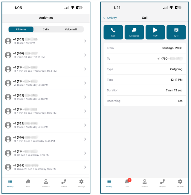 All calls and voicemails listed chronologically, with the most recent at the top.